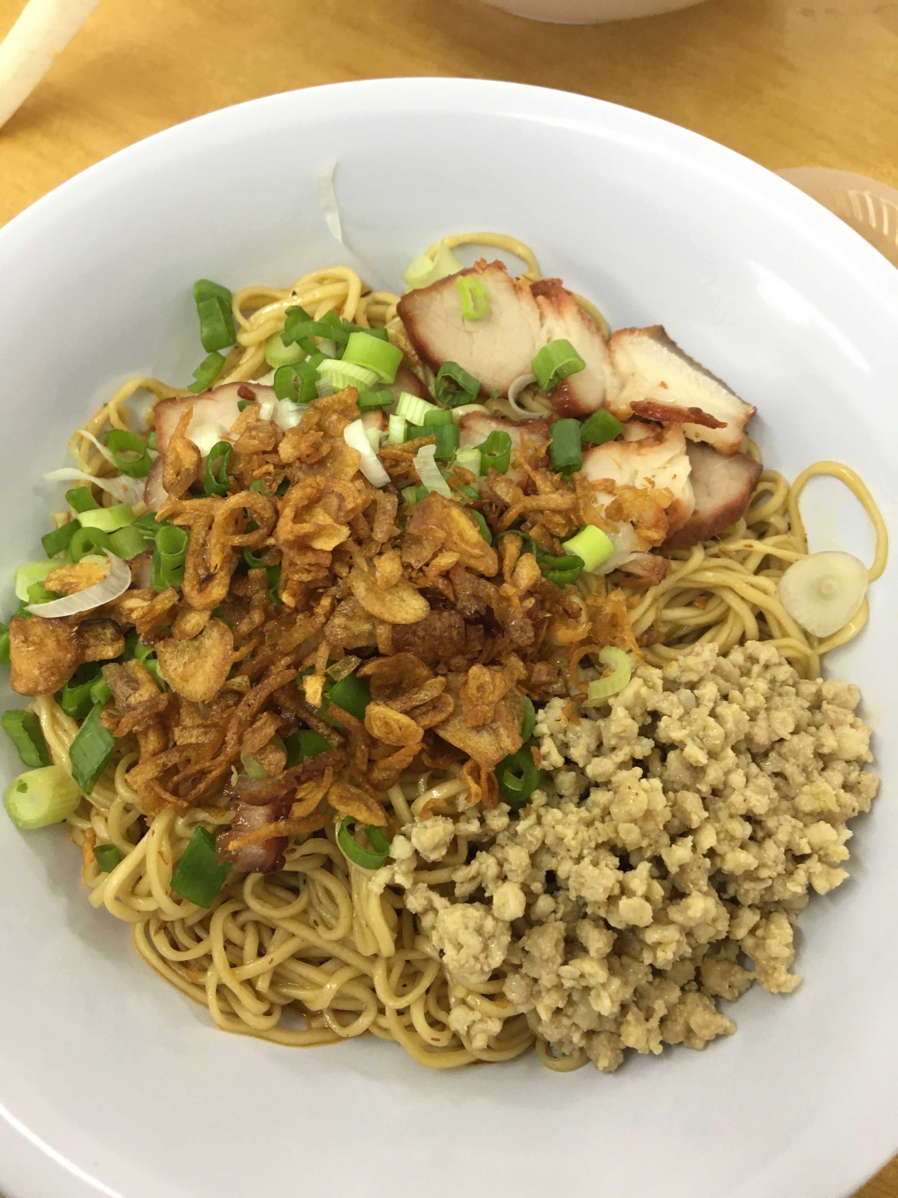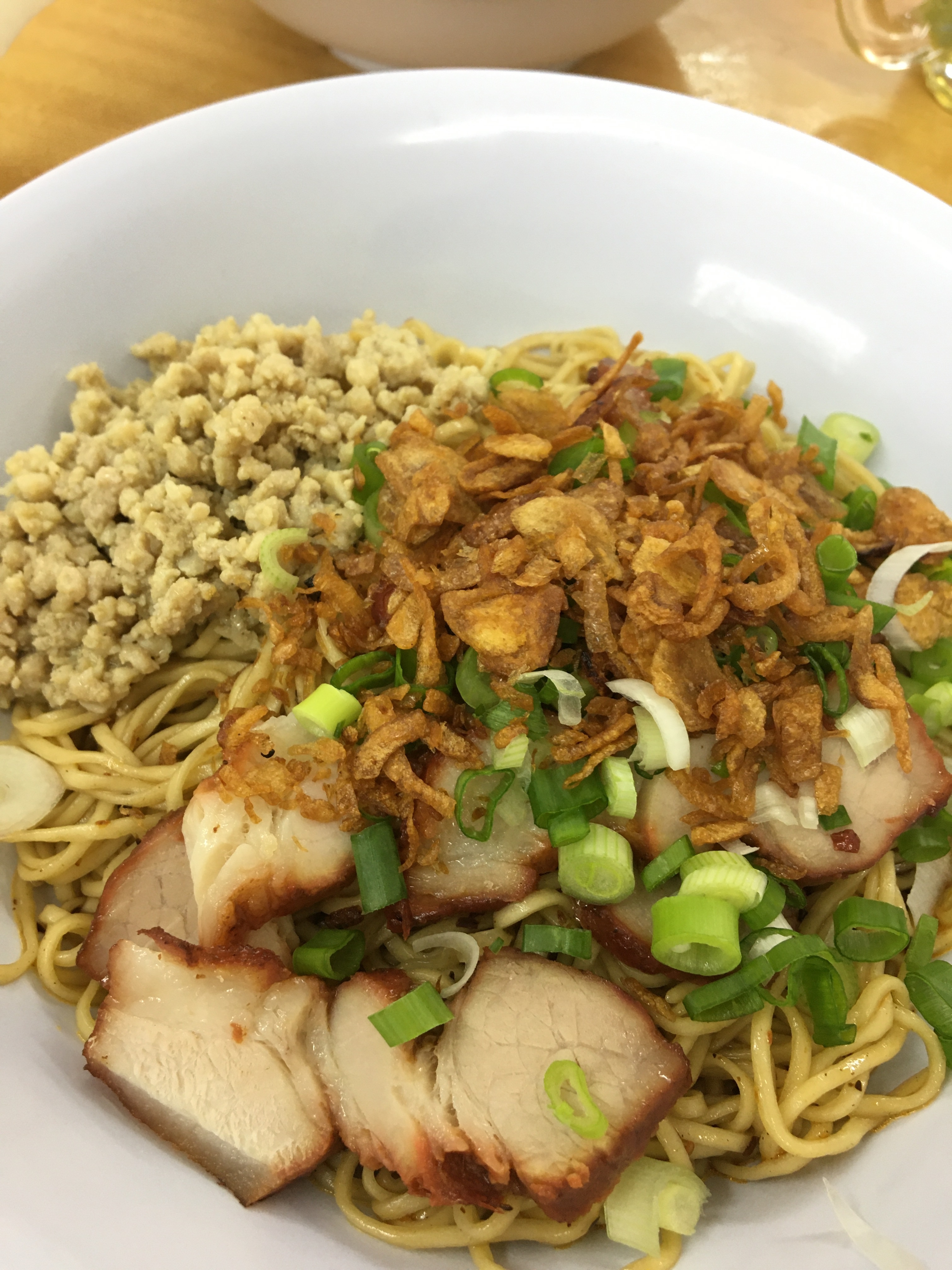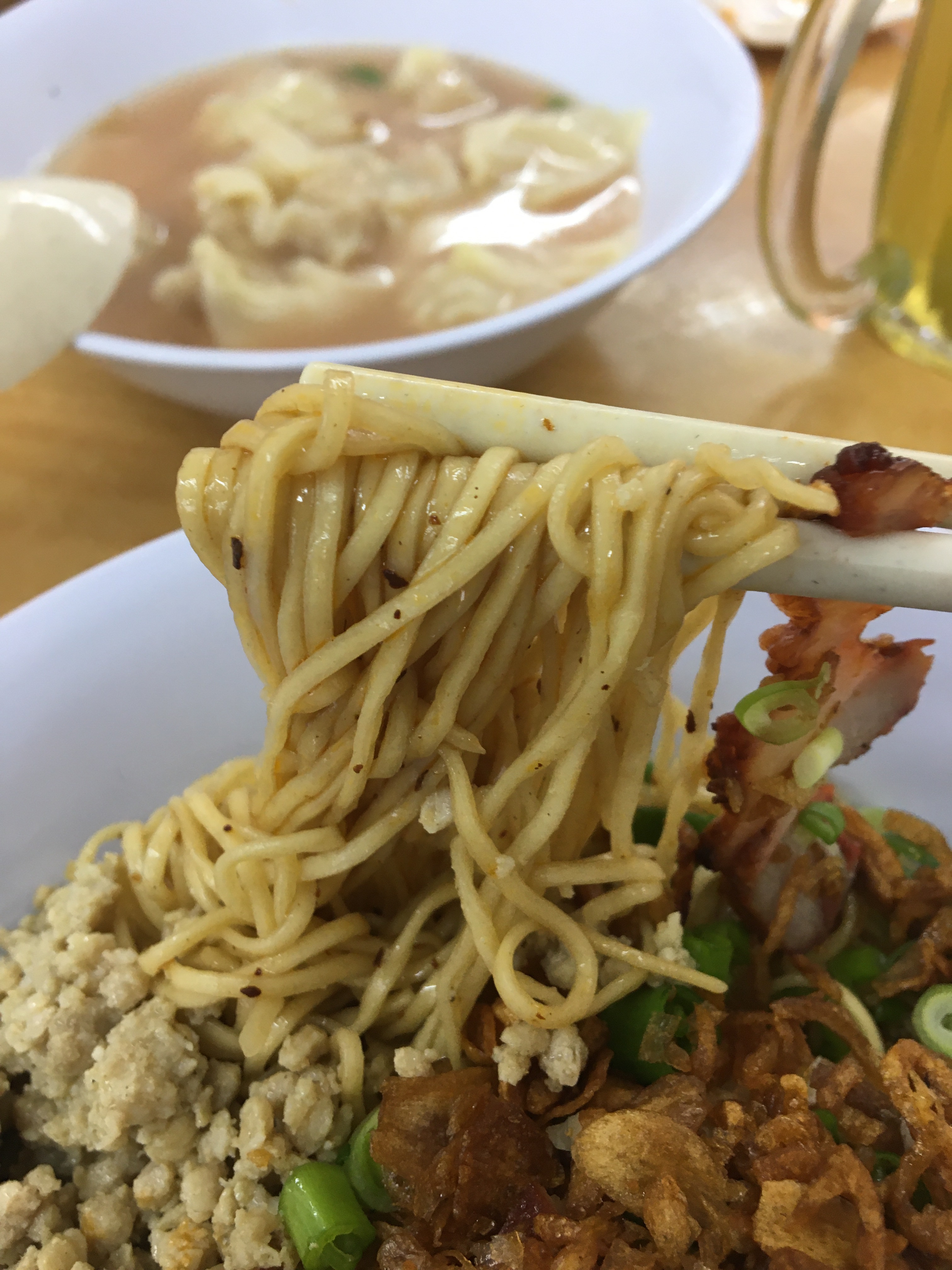 首先,我十分鍾意食扁肉(類似於雲吞),一係肉餡醃的夠味,二係湯底有加上紅酒,兩者配合的十分開胃。再來乾盤麵係自家製,麵條唔煮的太軟,保留返麵勁的嚼勁,再將同樣係自家牌的炸洋蔥,叉燒,肉碎,青蔥連同豬油醬油攪拌,可想而知味道係幾咁豐富!